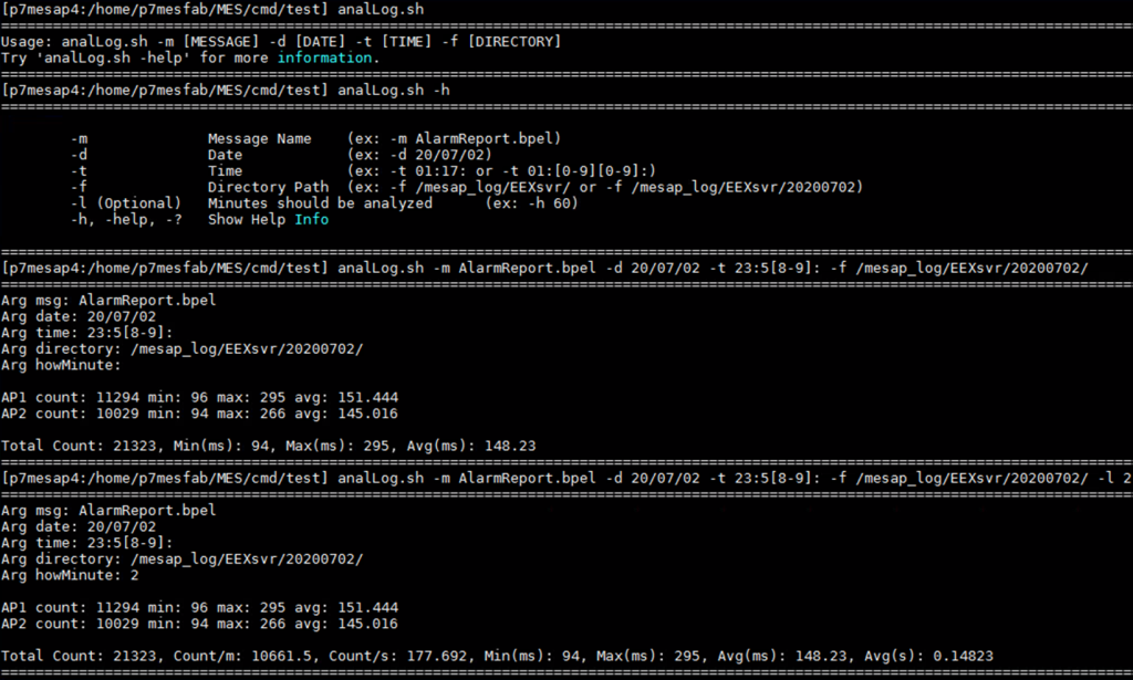 -m: 검색할 메시지 이름 (예:AlarmReport.bpel)-d: 검색할 날짜 (예:20/07/02)-t: 검색할 시간 (예:01:17:또는01:[0-9][0-9]:)-f: 검색할 원격 서버의 로그 디렉터리 경로 (예:/mesap_log/EEXsvr/20200702)-l(선택 사항): 분석 대상 시간(분). (예:60)