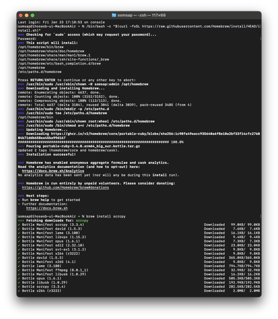 somsap@ihoseob-ui-MacBookAir ~ % brew install scrcpy