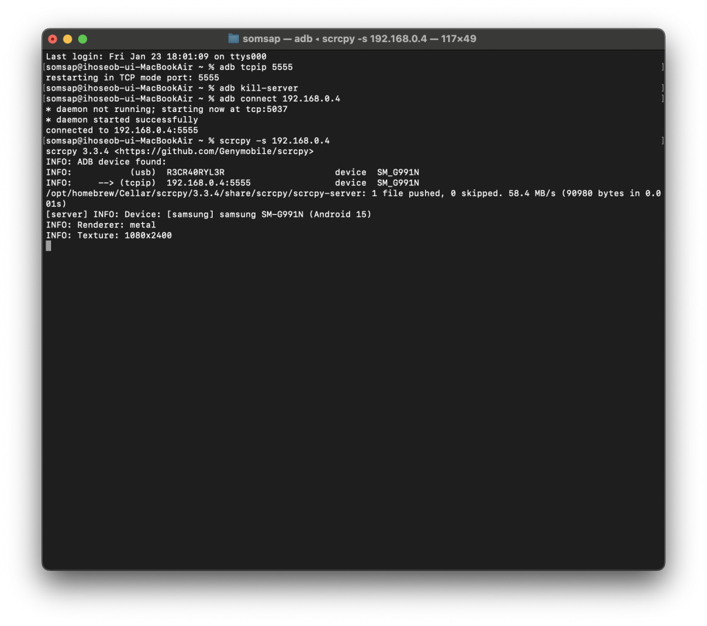somsap@ihoseob-ui-MacBookAir ~ % scrcpy -s 192.168.0.4