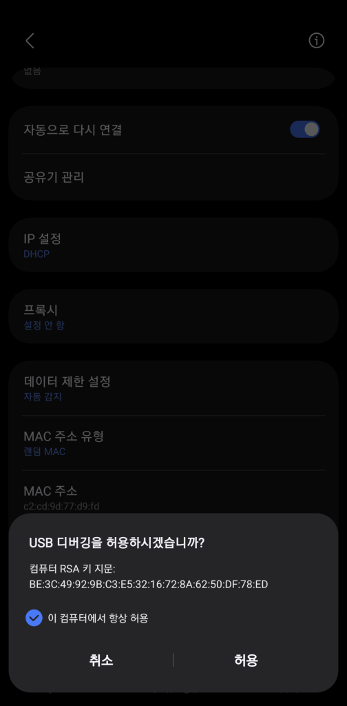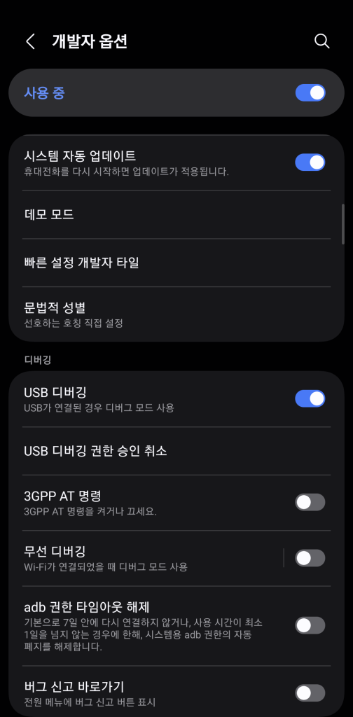- 다시 설정 > 개발자 옵션에 진입하여 USB 디버깅을 켜줍니다.