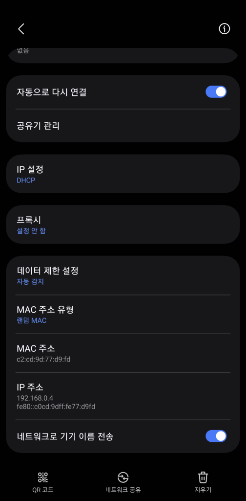 이제 케이블을 분리하셔도 됩니다. 스마트폰 설정의 와이파이 메뉴에서 현재 연결된 IP 주소를 확인합니다. (제 경우에는 192.168.0.4였습니다.)