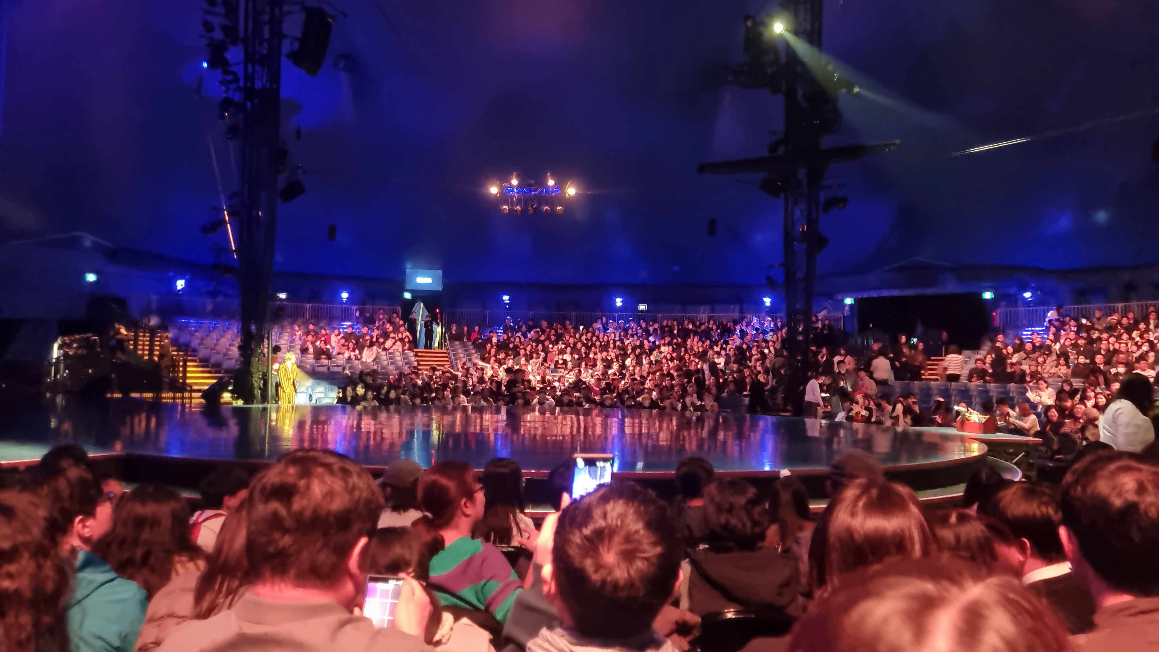 The interior of the venue was much taller than expected. The height to the ceiling was considerable, ensuring enough space for aerial performances. The stage was a 360-degree circular stage of moderate size. The number of seats wasn’t too many either, so it was cozy while being large enough not to miss any performances.
